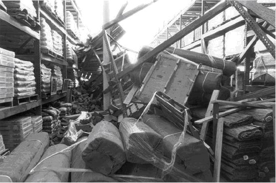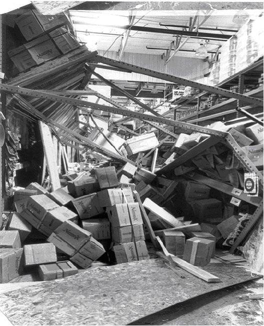 Φωτ. 1 Κατάρρευση μεταλλικών ραφιών από σεισμό κατά την εγκάρσια διεύθυνση σε αποθήκη πολυκαταστήματος στην Santa Clarita California στο τμήμα πλακιδίων.